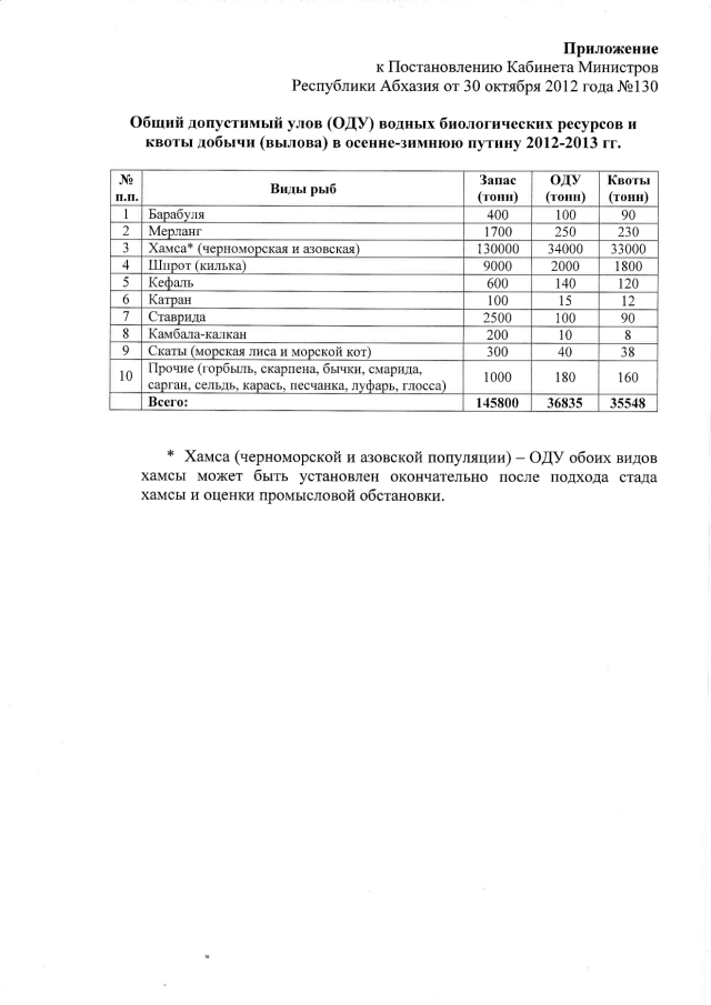 Постановление Кабинета Министров Республики Абхазия от 30.10.2012 № 130 "Об утверждении общего допустимого улова (ОДУ) водных биологических ресурсов и квот добычи (вылова) в осенне-зимнюю путину 2012-2013 гг."