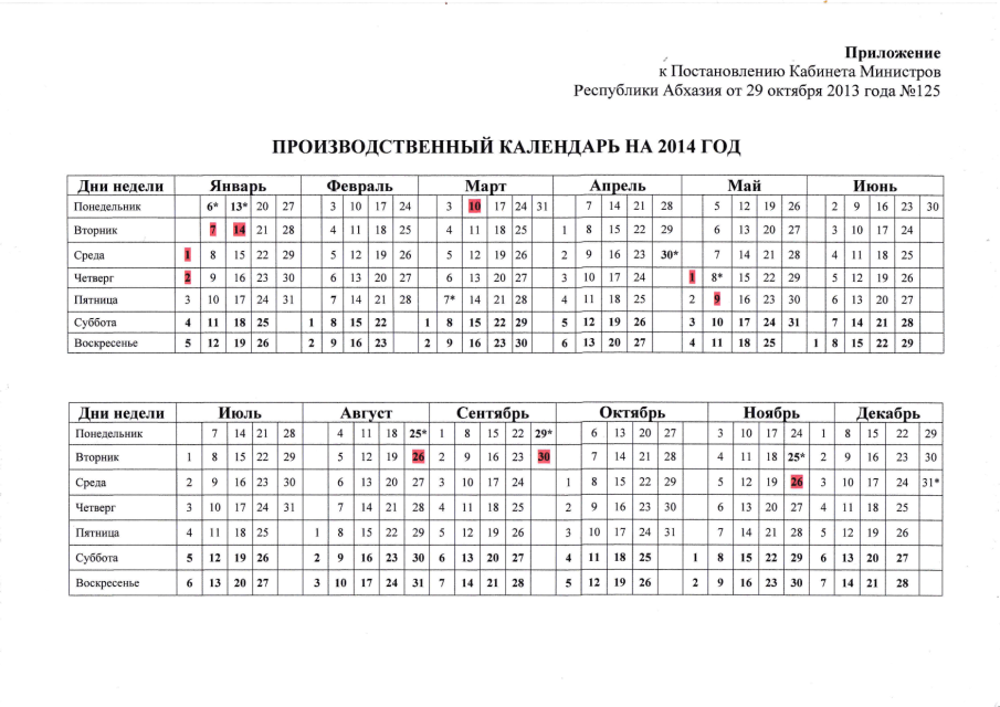 Постановление Кабинета Министров Республики Абхазия от 29.10.2013 № 125 "Об утверждении Производственного календаря на 2014 год"