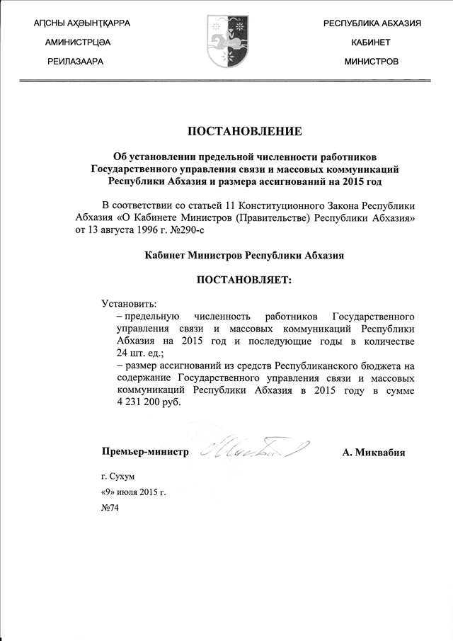 Постановление Кабинета Министров Республики Абхазия от 09.07.2015 № 74 "Об установлении предельной численности работников Государственного управления связи и массовых коммуникаций Республики Абхазия и размера ассигнований на 2015 год"