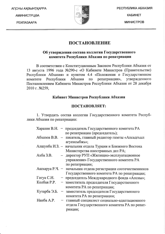 Постановление Кабинета Министров Республики Абхазия от 09.07.2015 № 76 "Об утверждении состава коллегии Государственного комитета Республики Абхазия по репатриации"