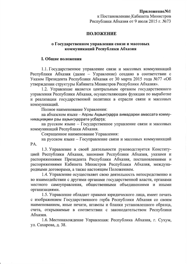 Постановление Кабинета Министров Республики Абхазия от 09.07.2015 № 73 "Об утверждении "Положения о Государственном управлении связи и массовых коммуникаций Республики Абхазия"