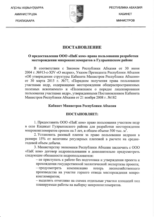 Постановление Кабинета Министров Республики Абхазия от 09.07.2015 № 78 "О предоставлении ООО "ПиК ком" права пользования разработки месторождения микроконгломератов в Гулрыпшском районе"