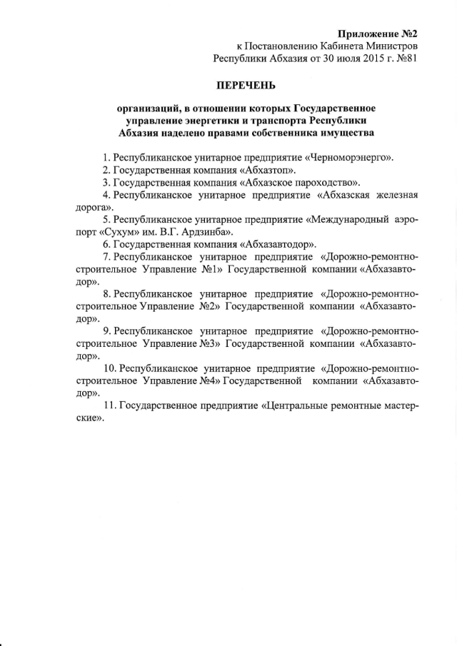 Постановление Кабинета Министров Республики Абхазия от 30.07.2015 № 81 "Об утверждении "Положения о Государственном управлении энергетики и транспорта Республики Абхазия"