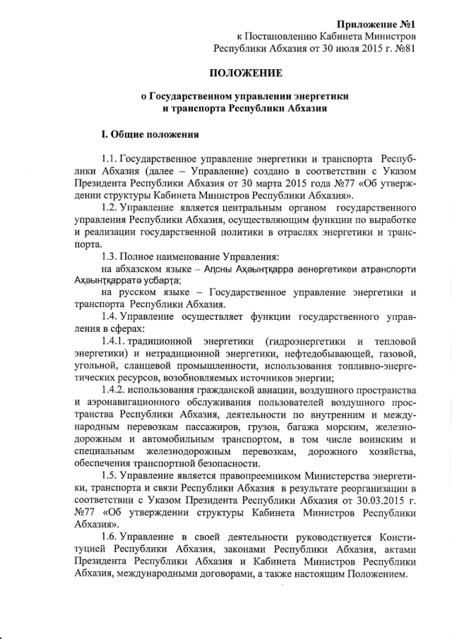 Постановление Кабинета Министров Республики Абхазия от 30.07.2015 № 81 "Об утверждении "Положения о Государственном управлении энергетики и транспорта Республики Абхазия"