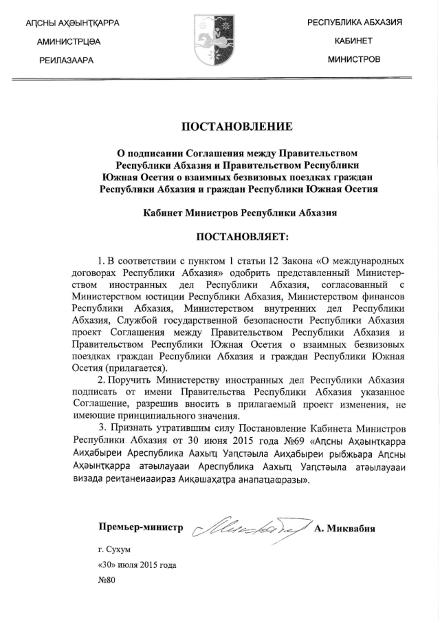 Постановление Кабинета Министров Республики Абхазия от 30.07.2015 № 80 "О подписании Соглашения между Правительством Республики Абхазия и Правительством Республики Южная Осетия о взаимных безвизовых поездках граждан Республики Абхазия и граждан Республики Южная Осетия"