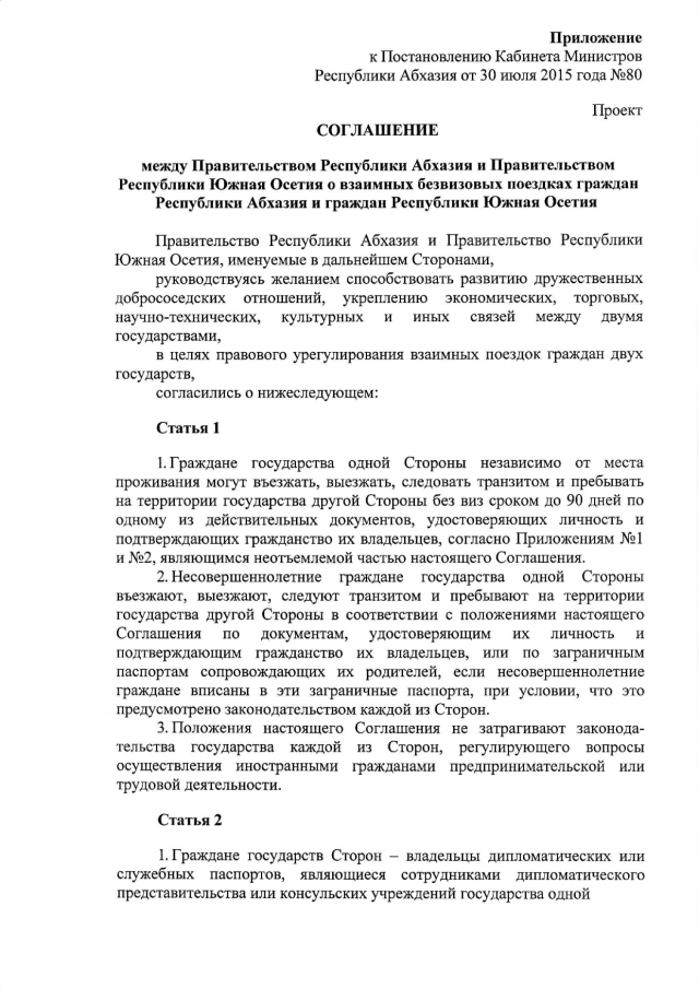 Постановление Кабинета Министров Республики Абхазия от 30.07.2015 № 80 "О подписании Соглашения между Правительством Республики Абхазия и Правительством Республики Южная Осетия о взаимных безвизовых поездках граждан Республики Абхазия и граждан Республики Южная Осетия"