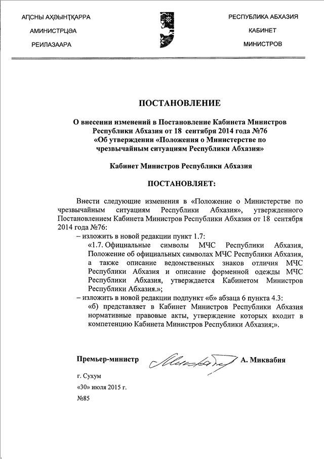 Постановление Кабинета Министров Республики Абхазия от 30.07.2015 № 85 "О внесении изменений в Постановление Кабинета Министров Республики Абхазия от 18 сентября 2014 года № 76 "Об утверждении "Положения о Министерстве по чрезвычайным ситуациям Республики Абхазия"