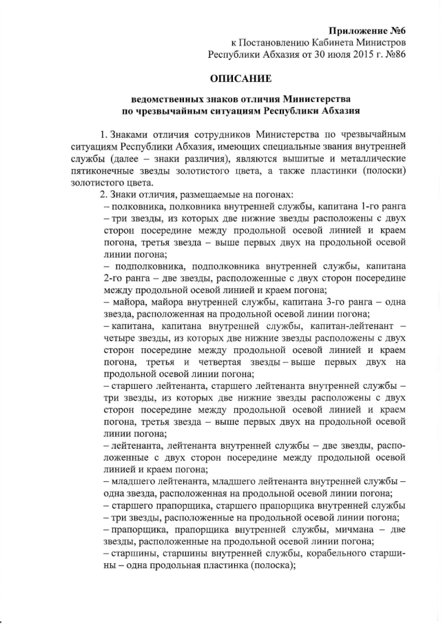 Постановление Кабинета Министров Республики Абхазия от 30.07.2015 № 86 "Об утверждении официальных символов Министерства по чрезвычайным ситуациям Республики Абхазия, описания форменной одежды и ведомственных знаков отличия сотрудников Министерства по чрезвычайным ситуациям Республики Абхазия"