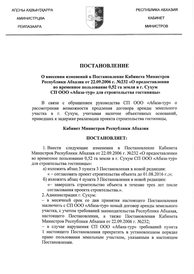 Постановление Кабинета Министров Республики Абхазия от 30.07.2015 № 93 "О внесении изменений в Постановление Кабинета Министров Республики Абхазия от 22.09.2006 г. № 232 "О предоставлении во временное пользование 0,52 га земли в г. Сухум СП ООО "Абаза-тур" для строительства гостиницы"