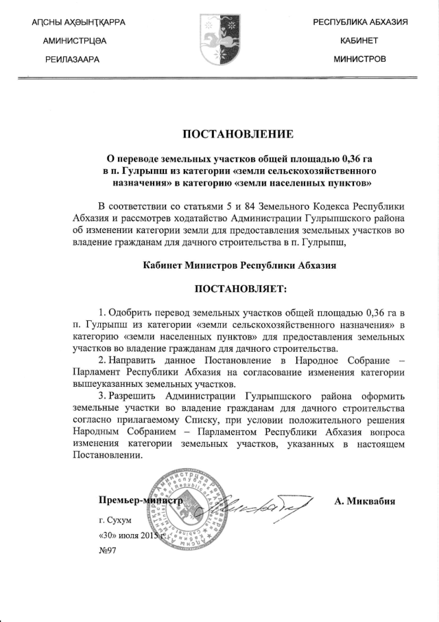 Постановление Кабинета Министров Республики Абхазия от 30.07.2015 № 97 "О переводе земельных участков общей площадью 0,36 га в п. Гулрыпш из категории "земли сельскохозяйственного назначения" в категорию "земли населенных пунктов"