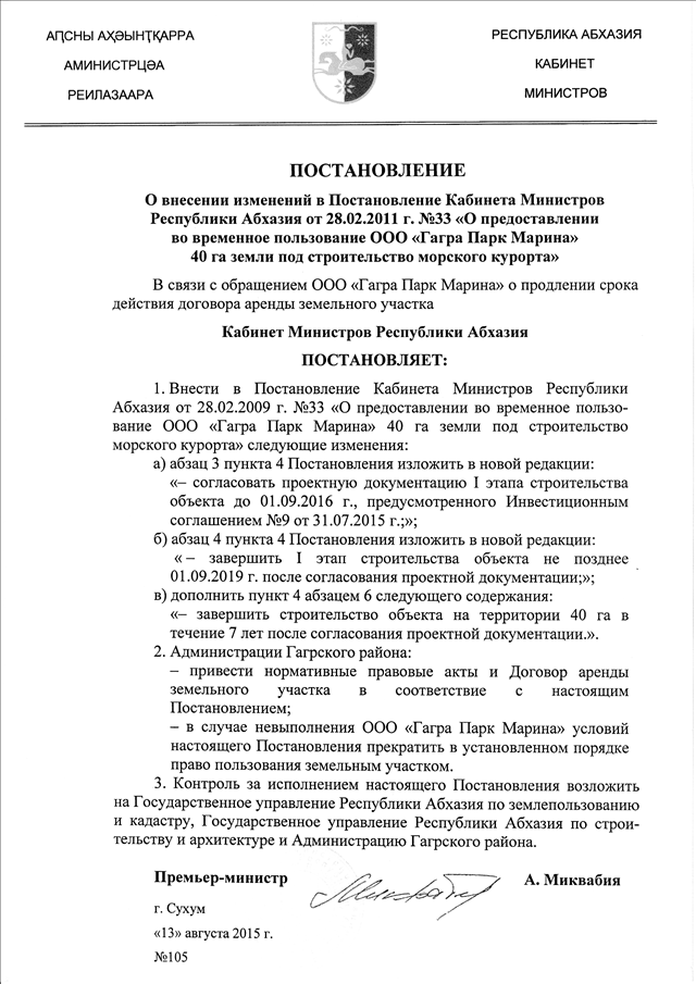 Постановление Кабинета Министров Республики Абхазия от 13.08.2015 № 105 "О внесении изменений в Постановление Кабинета Министров Республики Абхазия от 28.02.2011 г. № 33 "О предоставлении во временное пользование ООО "Гагра Парк Марина" 40 га земли под строительство морского курорта"