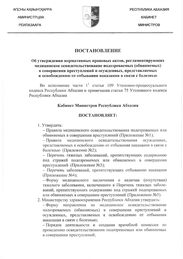 Постановление Кабинета Министров Республики Абхазия от 22.09.2015 № 123 "Об утверждении нормативных правовых актов, регламентирующих медицинское освидетельствование подозреваемых (обвиняемых) в совершении преступлений и осужденных, представляемых к освобождению от отбывания наказания в связи с болезнью"