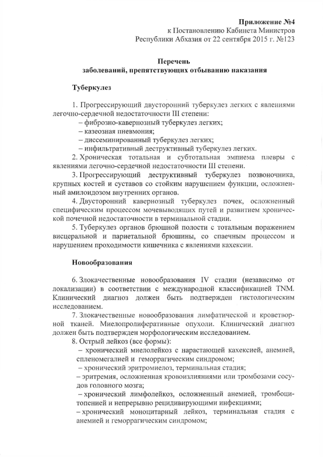 Постановление Кабинета Министров Республики Абхазия от 22.09.2015 № 123 "Об утверждении нормативных правовых актов, регламентирующих медицинское освидетельствование подозреваемых (обвиняемых) в совершении преступлений и осужденных, представляемых к освобождению от отбывания наказания в связи с болезнью"