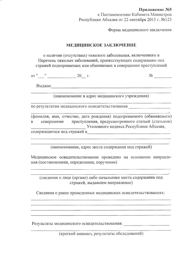 Постановление Кабинета Министров Республики Абхазия от 22.09.2015 № 123 "Об утверждении нормативных правовых актов, регламентирующих медицинское освидетельствование подозреваемых (обвиняемых) в совершении преступлений и осужденных, представляемых к освобождению от отбывания наказания в связи с болезнью"