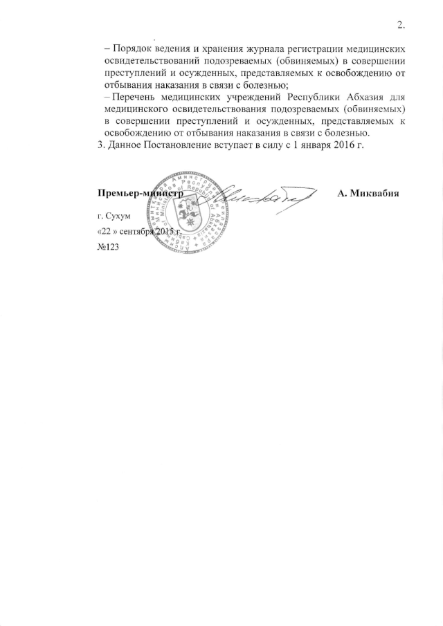 Постановление Кабинета Министров Республики Абхазия от 22.09.2015 № 123 "Об утверждении нормативных правовых актов, регламентирующих медицинское освидетельствование подозреваемых (обвиняемых) в совершении преступлений и осужденных, представляемых к освобождению от отбывания наказания в связи с болезнью"