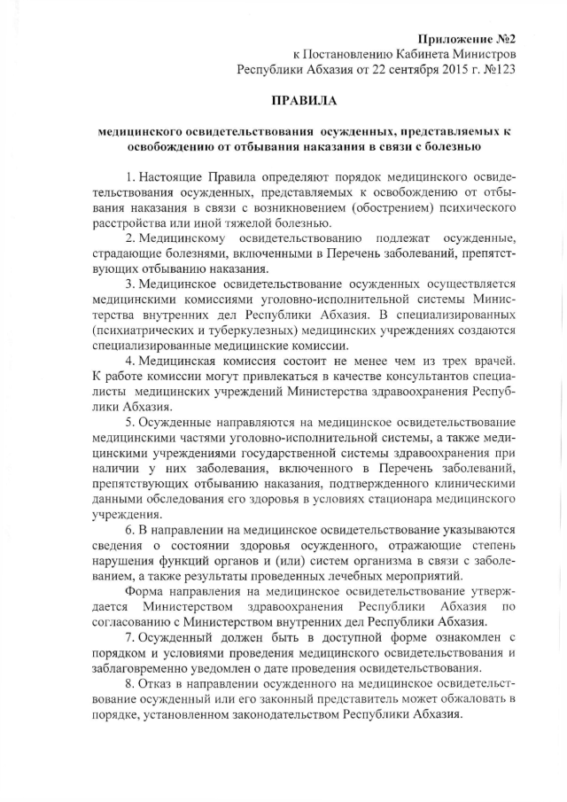 Постановление Кабинета Министров Республики Абхазия от 22.09.2015 № 123 "Об утверждении нормативных правовых актов, регламентирующих медицинское освидетельствование подозреваемых (обвиняемых) в совершении преступлений и осужденных, представляемых к освобождению от отбывания наказания в связи с болезнью"