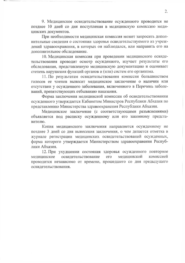 Постановление Кабинета Министров Республики Абхазия от 22.09.2015 № 123 "Об утверждении нормативных правовых актов, регламентирующих медицинское освидетельствование подозреваемых (обвиняемых) в совершении преступлений и осужденных, представляемых к освобождению от отбывания наказания в связи с болезнью"