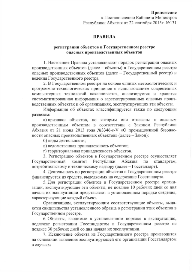 Постановление Кабинета Министров Республики Абхазия от 22.09.2015 № 131 "О регистрации объектов в Государственном реестре опасных производственных объектов"