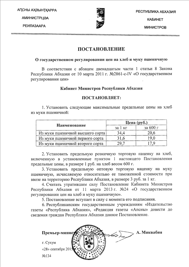 Постановление Кабинета Министров Республики Абхазия от 28.09.2015 № 134 "О государственном регулировании цен на хлеб и муку пшеничную"