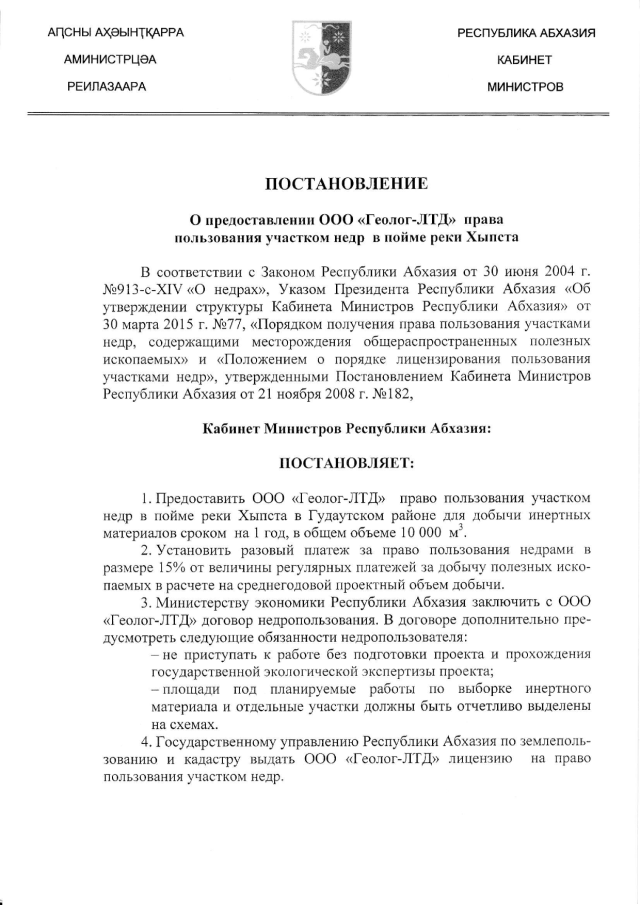 Постановление Кабинета Министров Республики Абхазия от 22.09.2015 № 133 "О предоставлении ООО "Геолог-ЛТД" права пользования участком недр в пойме реки Хыпста"