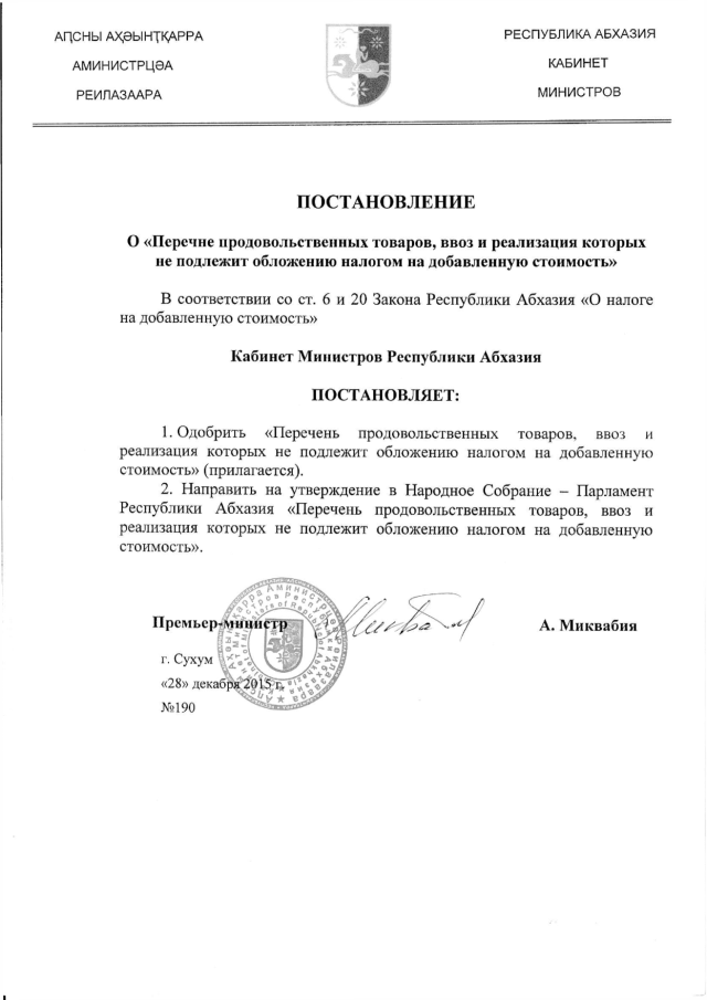 Постановление Кабинета Министров Республики Абхазия от 28.12.2015 № 190 "О "Перечне продовольственных товаров, ввоз и реализация которых не подлежит обложению налогом на добавленную стоимость"