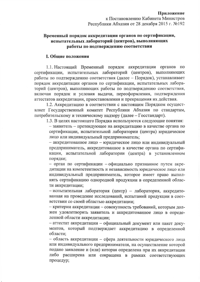 Постановление Кабинета Министров Республики Абхазия от 28.12.2015 № 192 "Об утверждении "Временного порядка аккредитации органов по сертификации, испытательных лабораторий (центров), выполняющих работы по подтверждению соответствия"