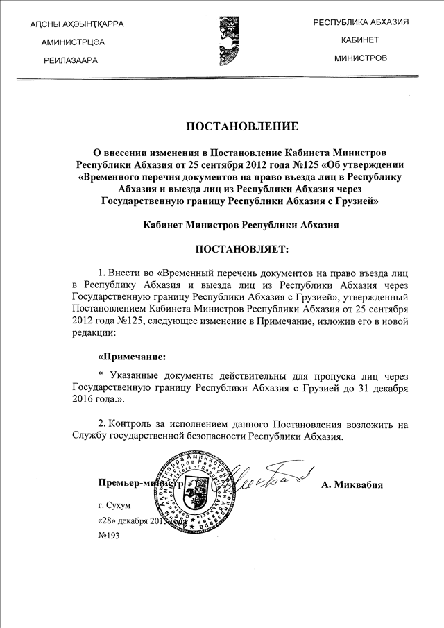 Постановление Кабинета Министров Республики Абхазия от 28.12.2015 № 193 "О внесении изменения в Постановление Кабинета Министров Республики Абхазия от 25 сентября 2012 года № 125 "Об утверждении "Временного перечня документов на право въезда лиц в Республику Абхазия и выезда лиц из Республики Абхазия через Государственную границу Республики Абхазия с Грузией"