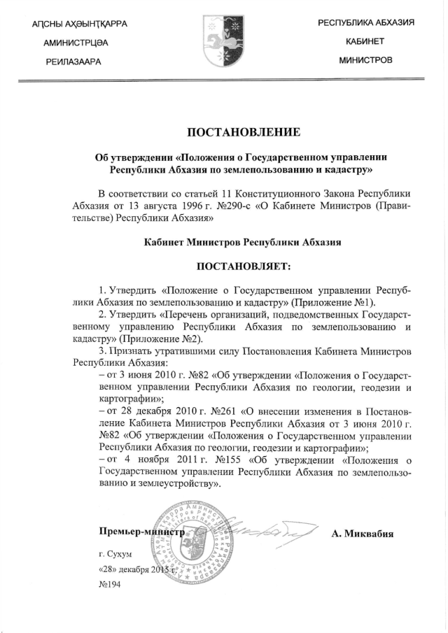 Постановление Кабинета Министров Республики Абхазия от 28.12.2015 № 194 "Об утверждении "Положения о Государственном управлении Республики Абхазия по землепользованию и кадастру"