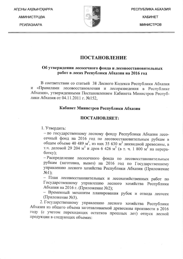 Постановление Кабинета Министров Республики Абхазия от 28.12.2015 № 195 "Об утверждении лесосечного фонда и лесовосстановительных работ в лесах Республики Абхазия на 2016 год"