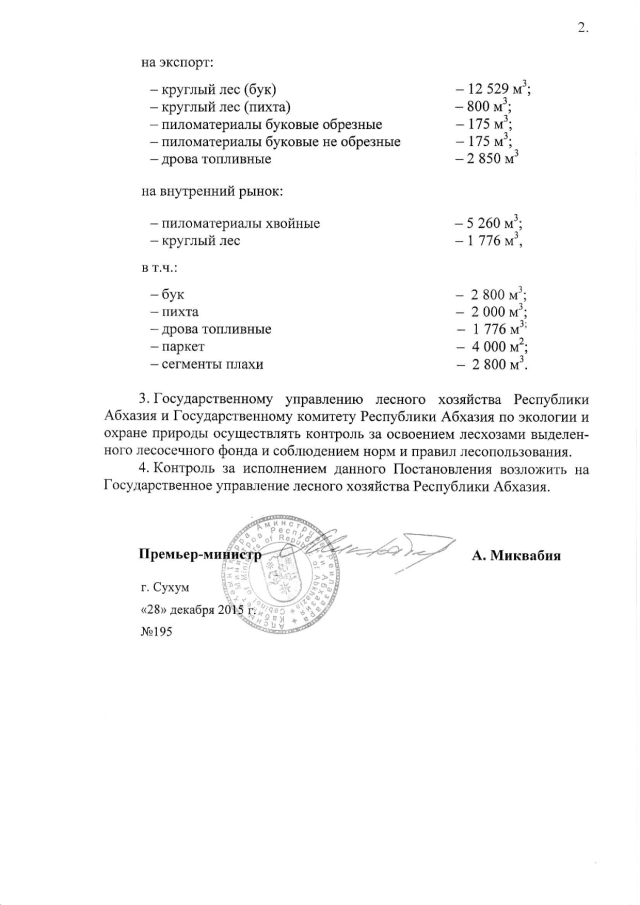 Постановление Кабинета Министров Республики Абхазия от 28.12.2015 № 195 "Об утверждении лесосечного фонда и лесовосстановительных работ в лесах Республики Абхазия на 2016 год"