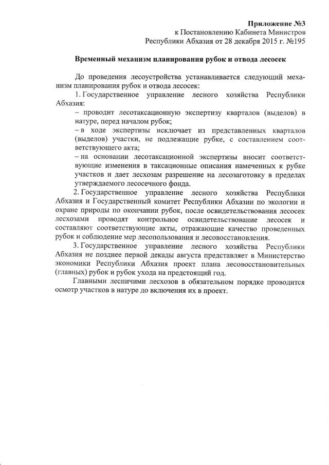 Постановление Кабинета Министров Республики Абхазия от 28.12.2015 № 195 "Об утверждении лесосечного фонда и лесовосстановительных работ в лесах Республики Абхазия на 2016 год"
