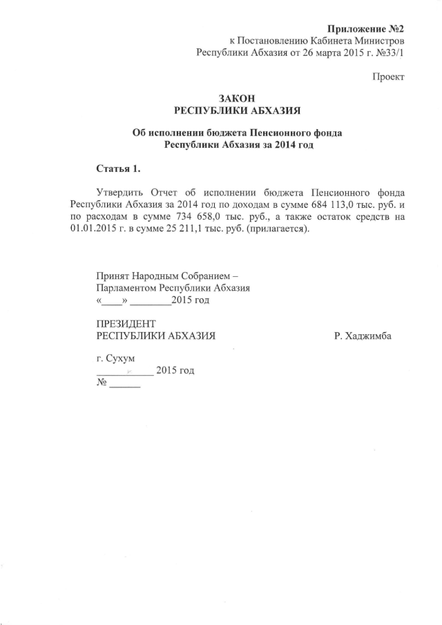 Постановление Кабинета Министров Республики Абхазия от 26.03.2015 № 33/1 "Об исполнении бюджета Пенсионного фонда Республики Абхазия за 2014 год"