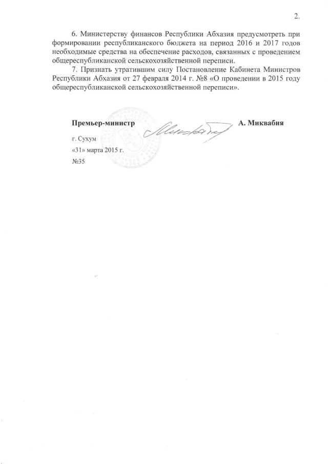Постановление Кабинета Министров Республики Абхазия от 31.03.2015 № 35 "О проведении в 2016 году общереспубликанской сельскохозяйственной переписи"