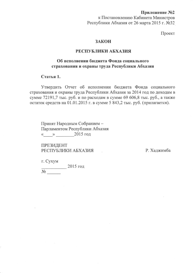 Постановление Кабинета Министров Республики Абхазия от 26.03.2015 № 32 "Об исполнении бюджета Фонда социального страхования и охраны труда Республики Абхазия за 2014 год"