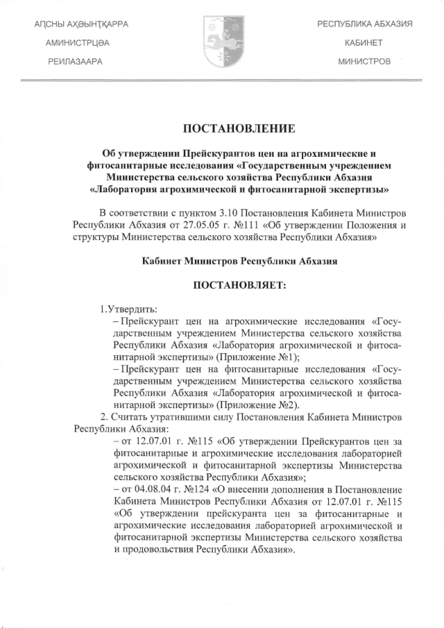Постановление Кабинета Министров Республики Абхазия от 31.03.2015 № 37 "Об утверждении Прейскурантов цен на агрохимические и фитосанитарные исследования "Государственным учреждением Министерства сельского хозяйства Республики Абхазия "Лаборатория агрохимической и фитосанитарной экспертизы"