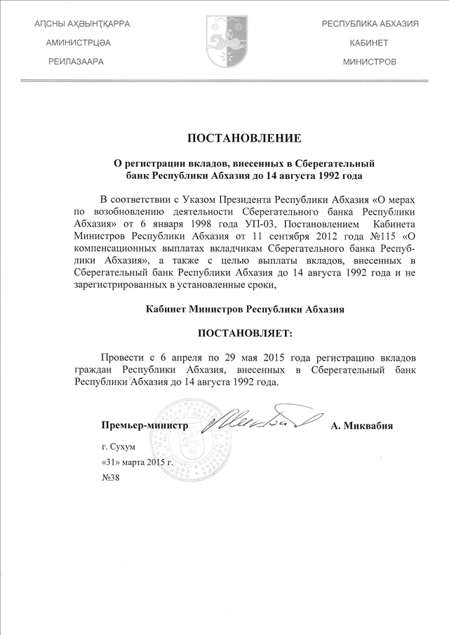 Постановление Кабинета Министров Республики Абхазия от 31.03.2015 № 38 "О регистрации вкладов, внесенных в Сберегательный банк Республики Абхазия до 14 августа 1992 года"