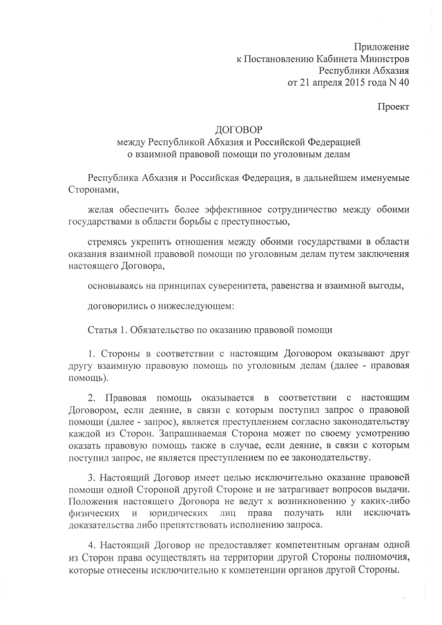 Постановление Кабинета Министров Республики Абхазия от 21.04.2015 № 40 "О проекте Договора между Республикой Абхазия и Российской Федерацией о взаимной правовой помощи по уголовным делам"