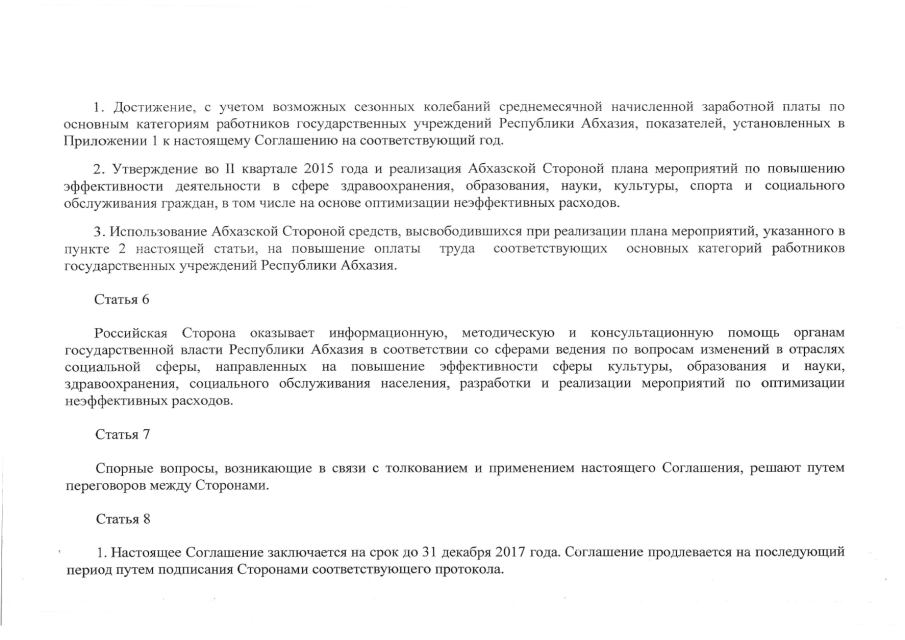 Постановление Кабинета Министров Республики Абхазия от 26.03.2015 № 34 "О проекте Соглашения между Республикой Абхазия и Российской Федерацией о порядке и условиях софинансирования за счет средств Российской Федерации повышения заработной платы основных категорий работников государственных учреждений Республики Абхазия в сфере здравоохранения, образования, науки, культуры, спорта и социального обслуживания граждан"