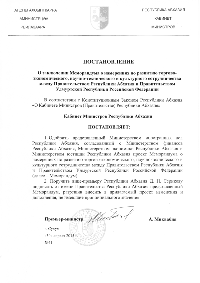 Постановление Кабинета Министров Республики Абхазия от 30.04.2015 № 41 "О заключении Меморандума о намерениях по развитию торгово-экономического, научно-технического и культурного сотрудничества между Правительством Республики Абхазия и Правительством Удмуртской Республики Российской Федерации"