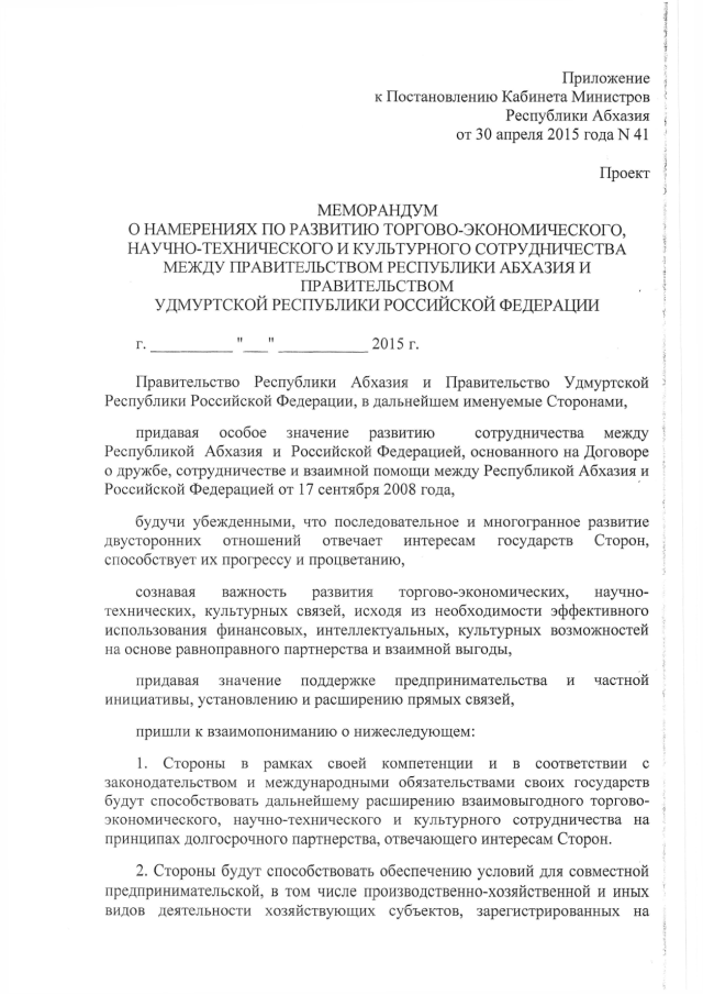 Постановление Кабинета Министров Республики Абхазия от 30.04.2015 № 41 "О заключении Меморандума о намерениях по развитию торгово-экономического, научно-технического и культурного сотрудничества между Правительством Республики Абхазия и Правительством Удмуртской Республики Российской Федерации"