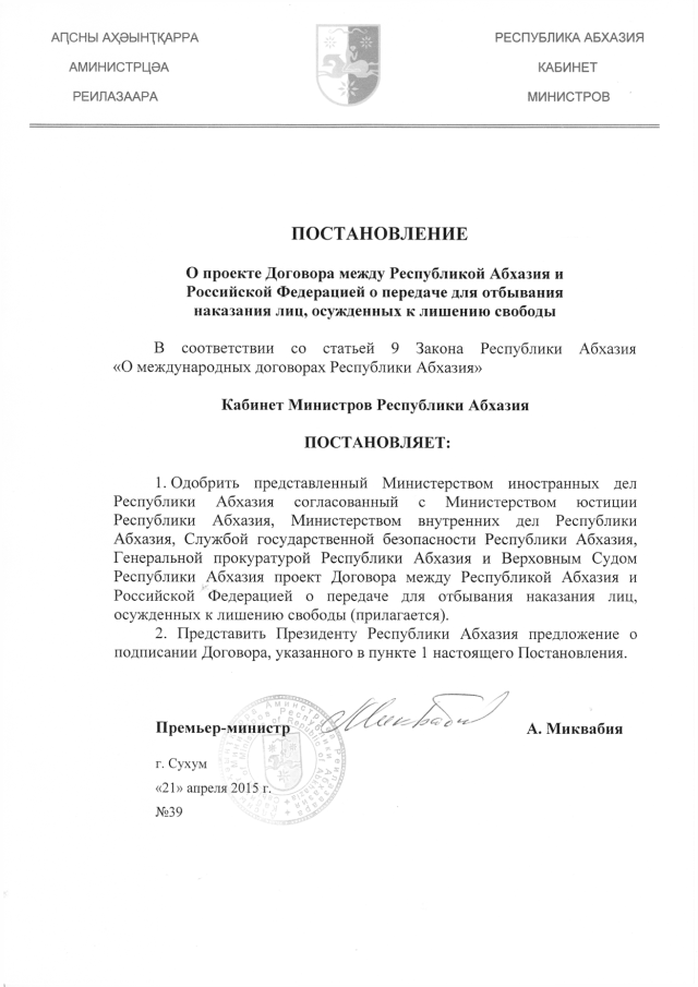 Постановление Кабинета Министров Республики Абхазия от 21.04.2015 № 39 "О проекте Договора между Республикой Абхазия и Российской Федерацией о передаче для отбывания наказания лиц, осужденных к лишению свободы"