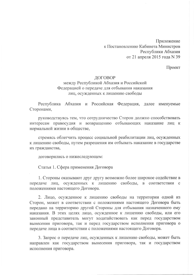 Постановление Кабинета Министров Республики Абхазия от 21.04.2015 № 39 "О проекте Договора между Республикой Абхазия и Российской Федерацией о передаче для отбывания наказания лиц, осужденных к лишению свободы"