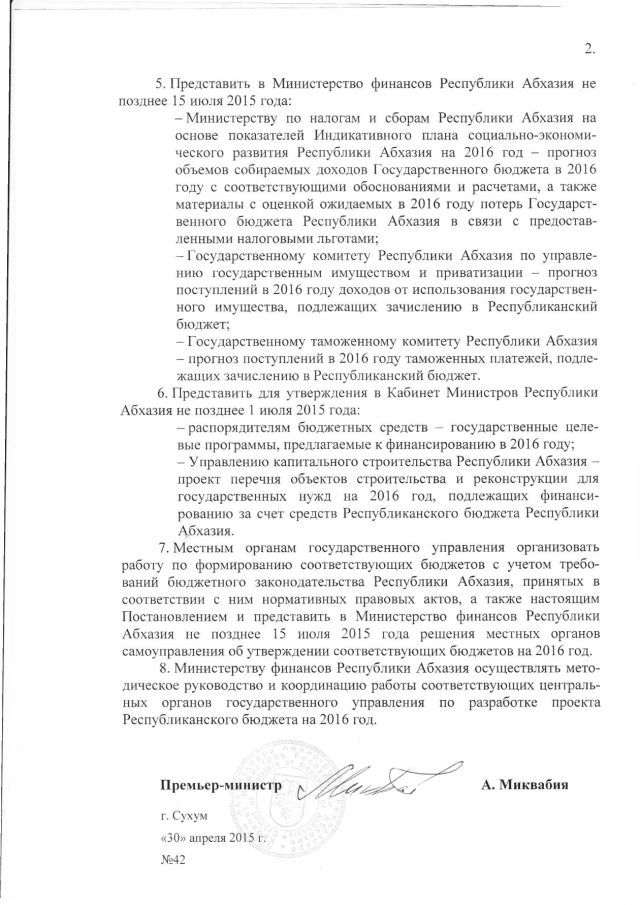 Постановление Кабинета Министров Республики Абхазия от 30.04.2015 № 42 "Об организации работы по составлению проектов законов Республики Абхазия "О Республиканском бюджете и бюджетах государственных внебюджетных фондах Республики Абхазия на 2016 год"