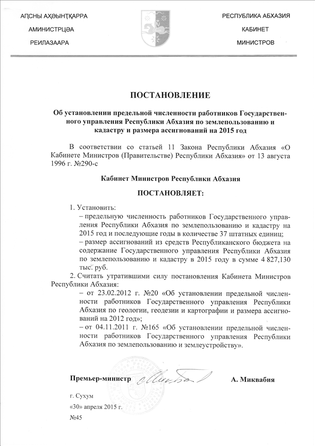 Постановление Кабинета Министров Республики Абхазия от 30.04.2015 № 45 "Об установлении предельной численности работников Государственного управления Республики Абхазия по землепользованию и кадастру и размера ассигнований на 2015 год"