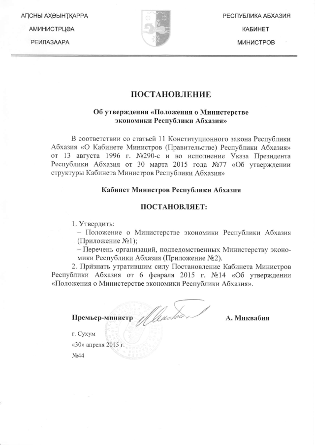 Постановление Кабинета Министров Республики Абхазия от 30.04.2015 № 44 "Об утверждении "Положения о Министерстве экономики Республики Абхазия"