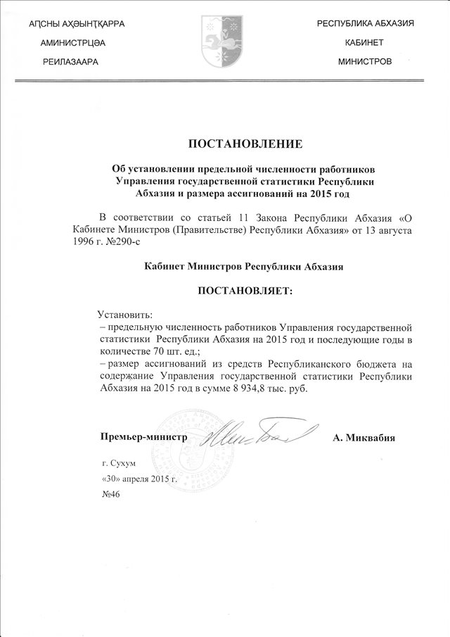 Постановление Кабинета Министров Республики Абхазия от 30.04.2015 № 46 "Об установлении предельной численности работников Управления государственной статистики Республики Абхазия и размера ассигнований на 2015 год"