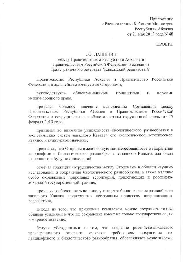 Постановление Кабинета Министров Республики Абхазия от 21.05.2015 № 48 "О заключении Соглашения между Правительством Республики Абхазия и Правительством Российской Федерации о создании трансграничного резервата "Кавказский реликтовый"