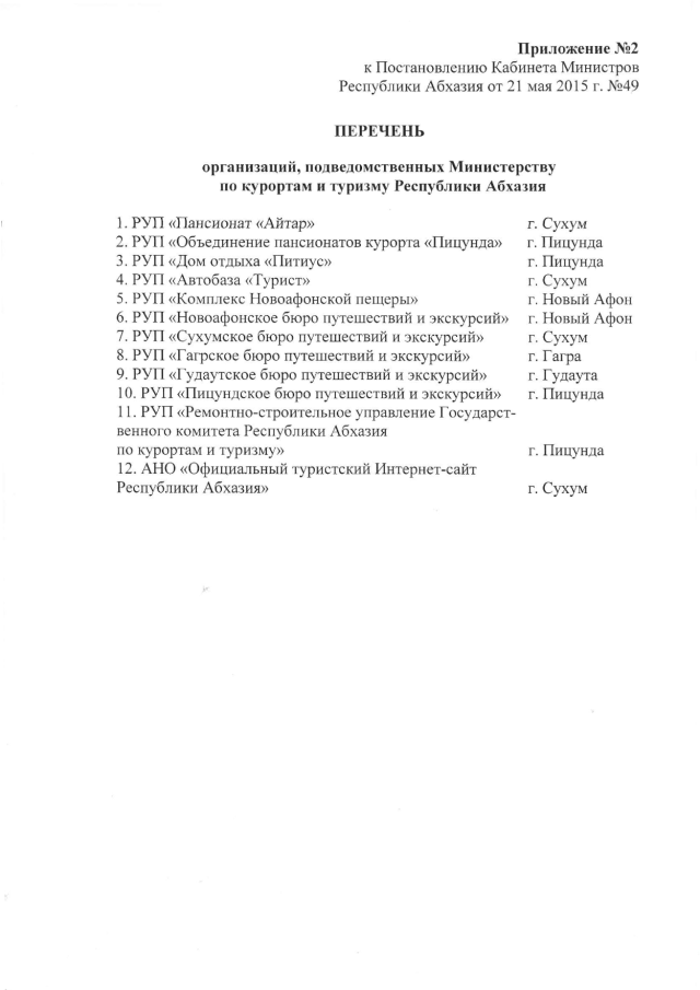 Постановление Кабинета Министров Республики Абхазия от 21.05.2015 № 49 "Об утверждении "Положения о Министерстве по курортам и туризму Республики Абхазия"