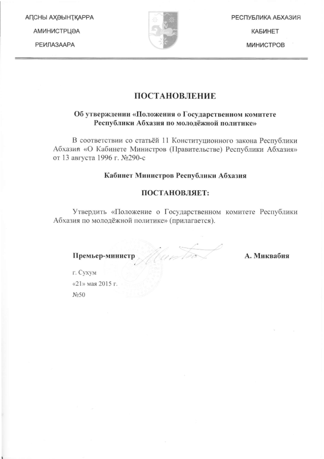 Постановление Кабинета Министров Республики Абхазия от 21.05.2015 № 50 "Об утверждении "Положения о Государственном комитете Республики Абхазия по молодёжной политике"