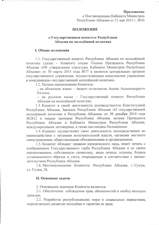 Постановление Кабинета Министров Республики Абхазия от 21.05.2015 № 50 "Об утверждении "Положения о Государственном комитете Республики Абхазия по молодёжной политике"